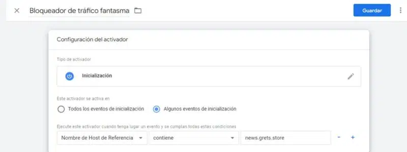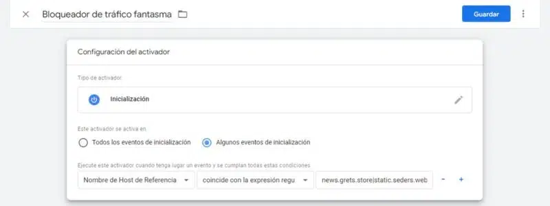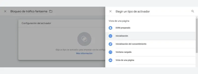 • Asignar un nombre al Activador como «Bloqueo de tráfico fantasma» y configura el activador seleccionando el tipo (Elegi «Inicialización» pero depende de tu caso tal vez tengas que elegir DOM Ready o Vista de Página depende de como se active tu Gtag)