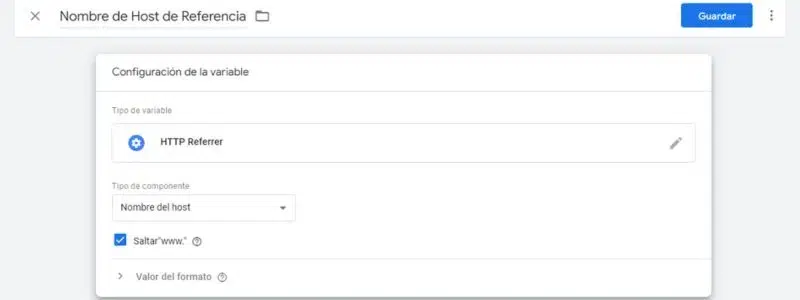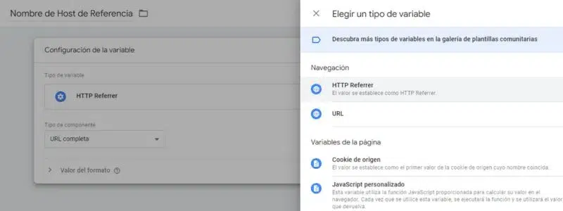 • Luego asigna un nombre a la variable como «Nombre de Host de Referencia», luego haz clic en configuración de la variable y selecciona «HTTP Referrer»