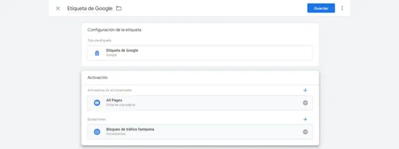 • Ahora ve a Etiquetas>Etiqueta de Google (o la que corresponda a su gtag principal a Google Analytics 4)
