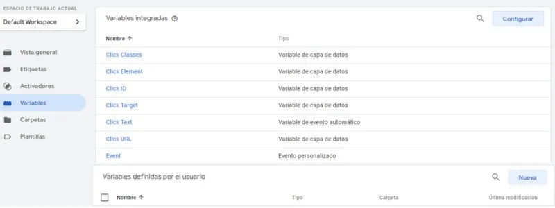 • En Google Tag Manager (GTM) haz clic en Variables.